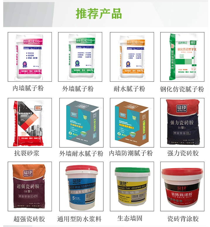 銘印建材(惠州)有限公司(惠州市展宏裝飾材料加工廠)是一家從事建筑裝飾材料生產的公司,憑借建材領域多年的實踐和施工經驗,研發出各種高、中檔內、外墻膩子粉、粘粉,瓷磚膠,旗下有【銘印】、【粵展宏】、【展美家】等品牌。銘印建材采用超前的設備和環保技術配方、生產出上等的裝飾材料、一直被客戶和消費者青睞,本廠堅持質量保障,信譽為本的服務宗旨,真誠的為客戶服務,歡迎互惠共贏。